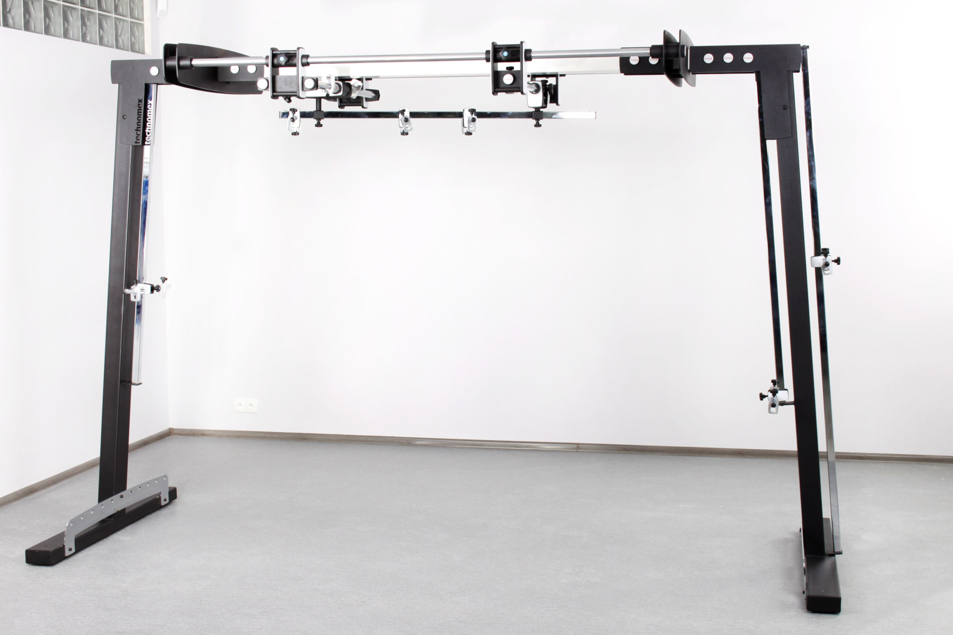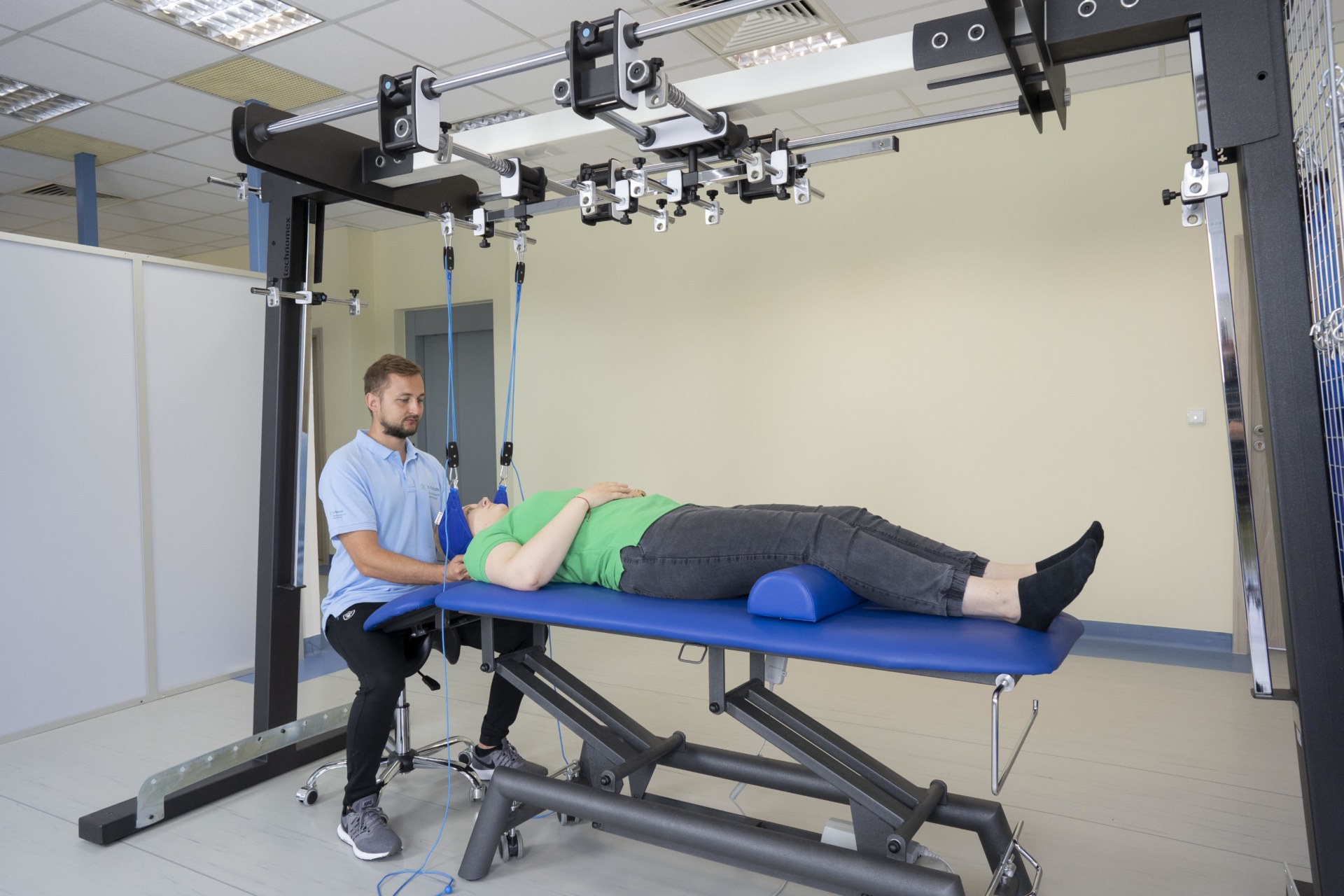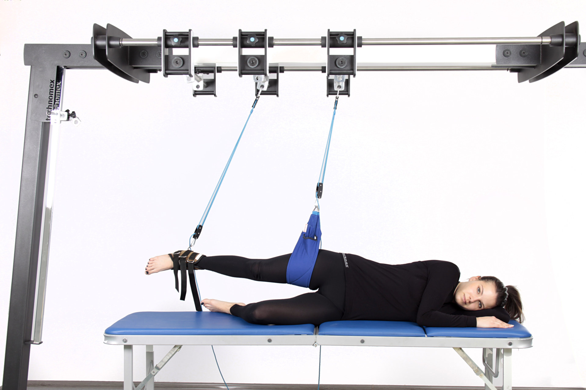 En la parte superior, está equipada con 12 puntos de suspensión, 6 laterales con altura variable, y en la parte inferior con puntos individuales pequeños para la fijación de cables y cinchas en ambos lados de la base. Los carros se deslizan sobre rodamientos de alta calidad, lo que garantiza un movimiento extremadamente suave y permite realizar ejercicios utilizando toda la longitud de los rieles, enriqueciendo la terapia en el dispositivo. Gracias a los múltiples puntos de anclaje para suspender accesorios y al brazo oscilante, esta versión cuenta con un rango de tratamiento más amplio que otros dispositivos similares disponibles en el mercado.